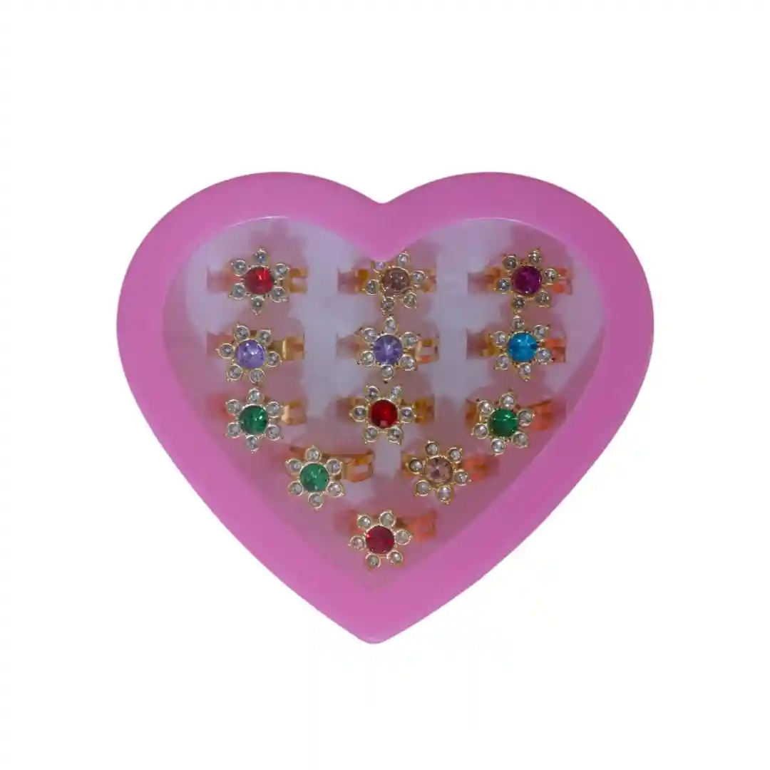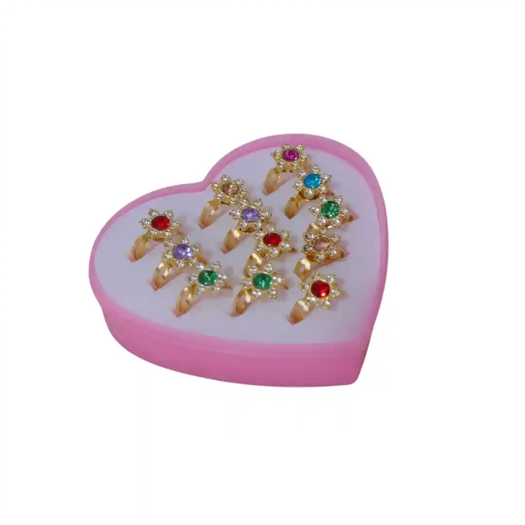 No lo pienses más, este set de 12 anillos en su linda caja de corazón es un tesoro para las más pequeñas. ¡Haz que su día sea mágico!
