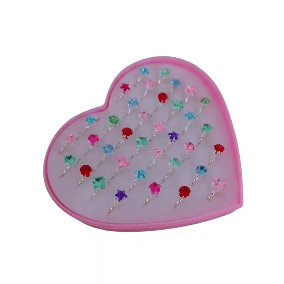 Imagina la emoción de tu hija, sobrina o amiguita al ver esta hermosa caja en forma de corazón. ¡Es un estuche lleno de magia y color! Y lo mejor de todo es la cantidad de anillos: ¡vienen 36 piezas! ¡Sí, 36! Es un verdadero tesoro para que puedan combinar con todos sus atuendos y usarlos en cualquier ocasión.