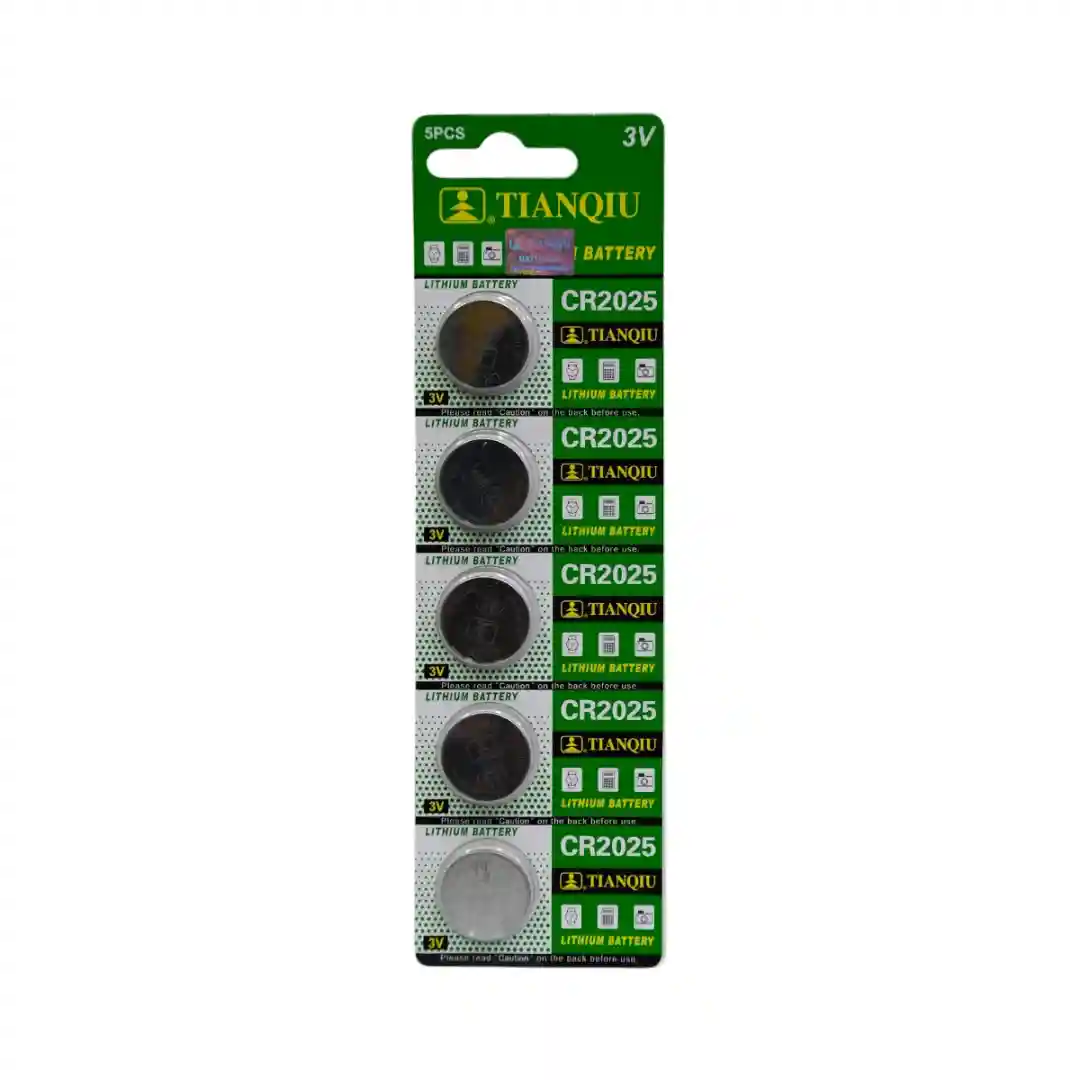 Paquete de 5 baterías de la marca TIANQIU, modelo CR2025, perfectas para esos pequeños aparatos que usas a diario. Estas baterías son tipo botón, conocidas por su versatilidad para usarse en una gran variedad de dispositivos electrónicos, como relojes, calculadoras, controles remotos, y más. Vienen en un empaque sellado para garantizar su frescura y protegerlas de cualquier daño.