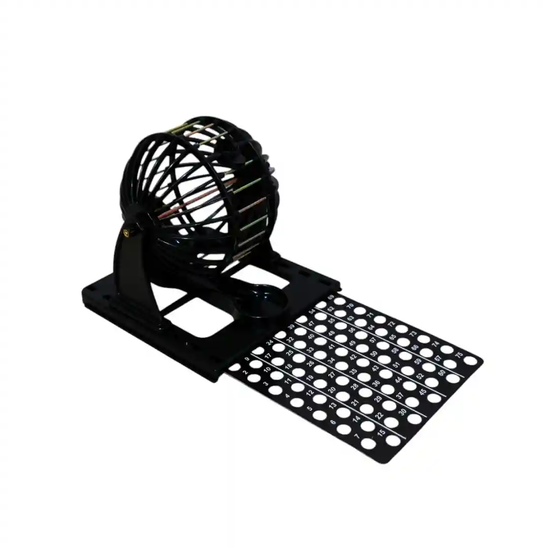 La máquina de Bingo con su jaula giratoria, lista para mezclar las bolas.