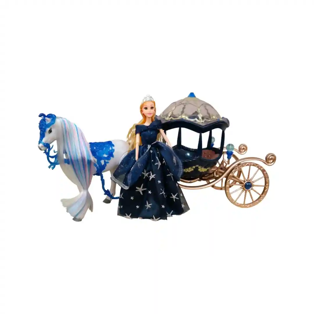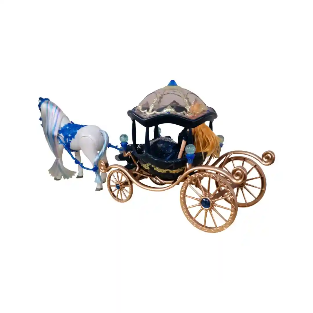 No puede haber un carruaje de princesa sin un corcel a la altura. El caballo es blanco, con crines y cola que son una explosión de color: tonos azules y blancos/celestes que fluyen con un aire totalmente fantástico. Además, lleva un hermoso arnés decorativo sobre el lomo en un llamativo azul brillante con textura de encaje o glitter, conectándolo con el carruaje mediante unas riendas azules. El caballo tiene una postura dinámica, listo para emprender el viaje.