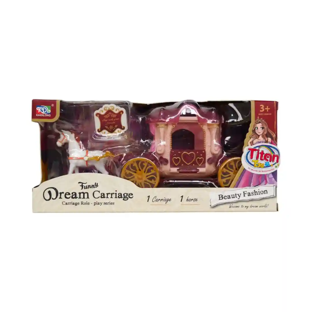 Diseño Real y Lujoso: Es una réplica encantadora de un carruaje de princesa, con una carroza central de color rosa claro y un techo y base de un elegante tono fucsia/vino. El diseño está lleno de detalles de fantasía, como pequeños pináculos en el techo y un adorno central, además de la forma de corazones que se ve en el costado, justo en el centro de la puerta.