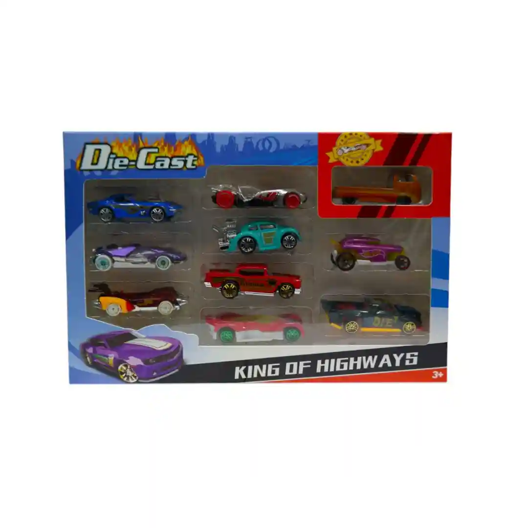 Este set se llama «KING OF HIGHWAYS» (Rey de las Carreteras) y es ideal para niños de 3 años en adelante. La caja tiene un diseño dinámico con llamas y un auto estilizado en la parte inferior, lo que le da un toque de velocidad y aventura.