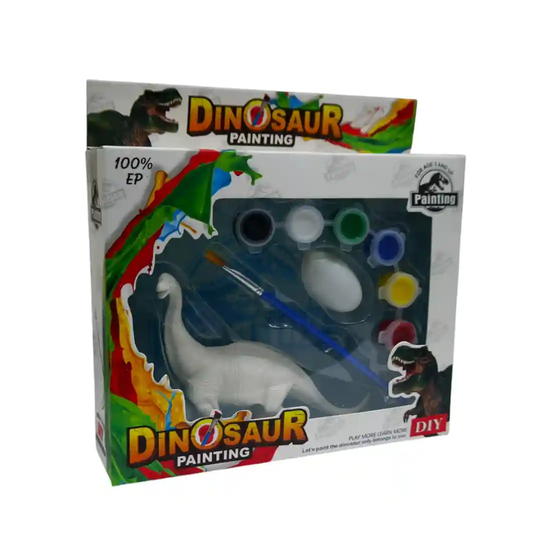 El set está diseñado para que los niños se sientan como verdaderos paleontólogos-artistas. Incluye una figura de dinosaurio de color blanco lista para ser pintada y, lo más genial, ¡un huevo también para que lo dejen a su gusto! Además, trae un set completo para empezar a pintar de inmediato: un pincel con mango azul y seis recipientes de pintura de diferentes colores: negro, blanco, verde, azul, amarillo y rojo. ¡Con esa paleta, pueden crear cualquier combinación que se les ocurra!