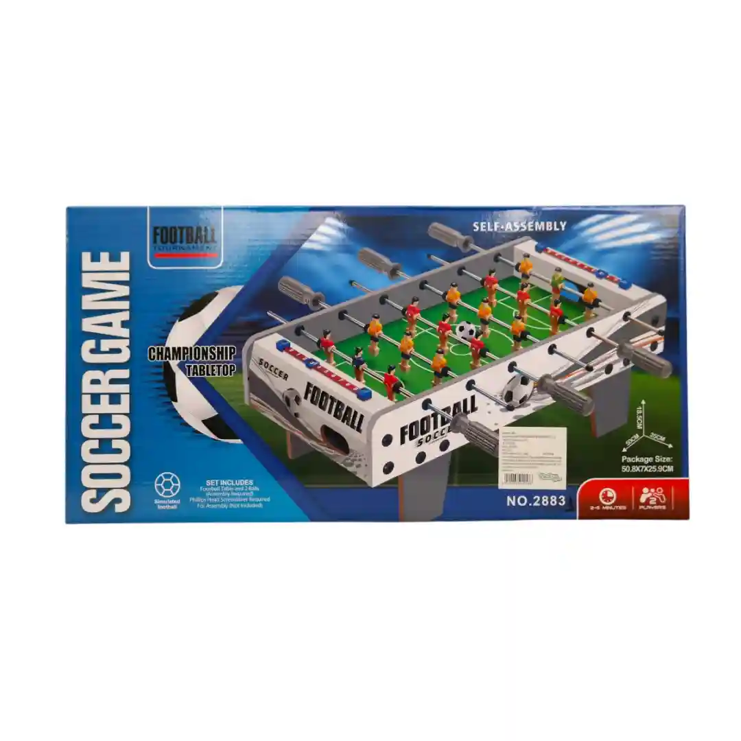 Este futbolín viene en un práctico paquete de 50.8 cm x 25.4 cm x 10.5 cm, lo que lo hace ideal para cualquier espacio. No necesitas una sala de juegos gigante, ¡puedes colocarlo en una mesa, un escritorio o incluso en el suelo y listo para jugar!