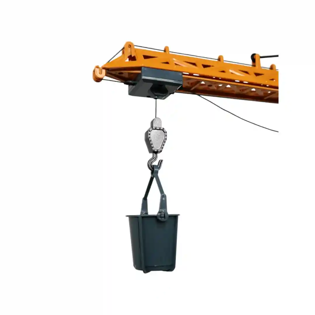 Gancho de Carga: El gancho de carga, de apariencia robusta y metálica, puede subir y bajar para levantar los accesorios. Viene con una cubeta o cucharón de plástico para transportar materiales, ¡perfecto para tus misiones de construcción!