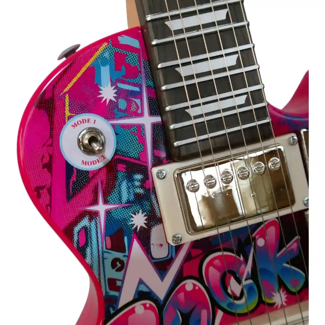 Modos de Sonido: El cuerpo de la guitarra incluye un interruptor para alternar entre MODE 1 y MODE 2, lo que probablemente cambia los sonidos, ritmos o efectos preestablecidos, ¡permitiendo explorar diferentes estilos musicales!