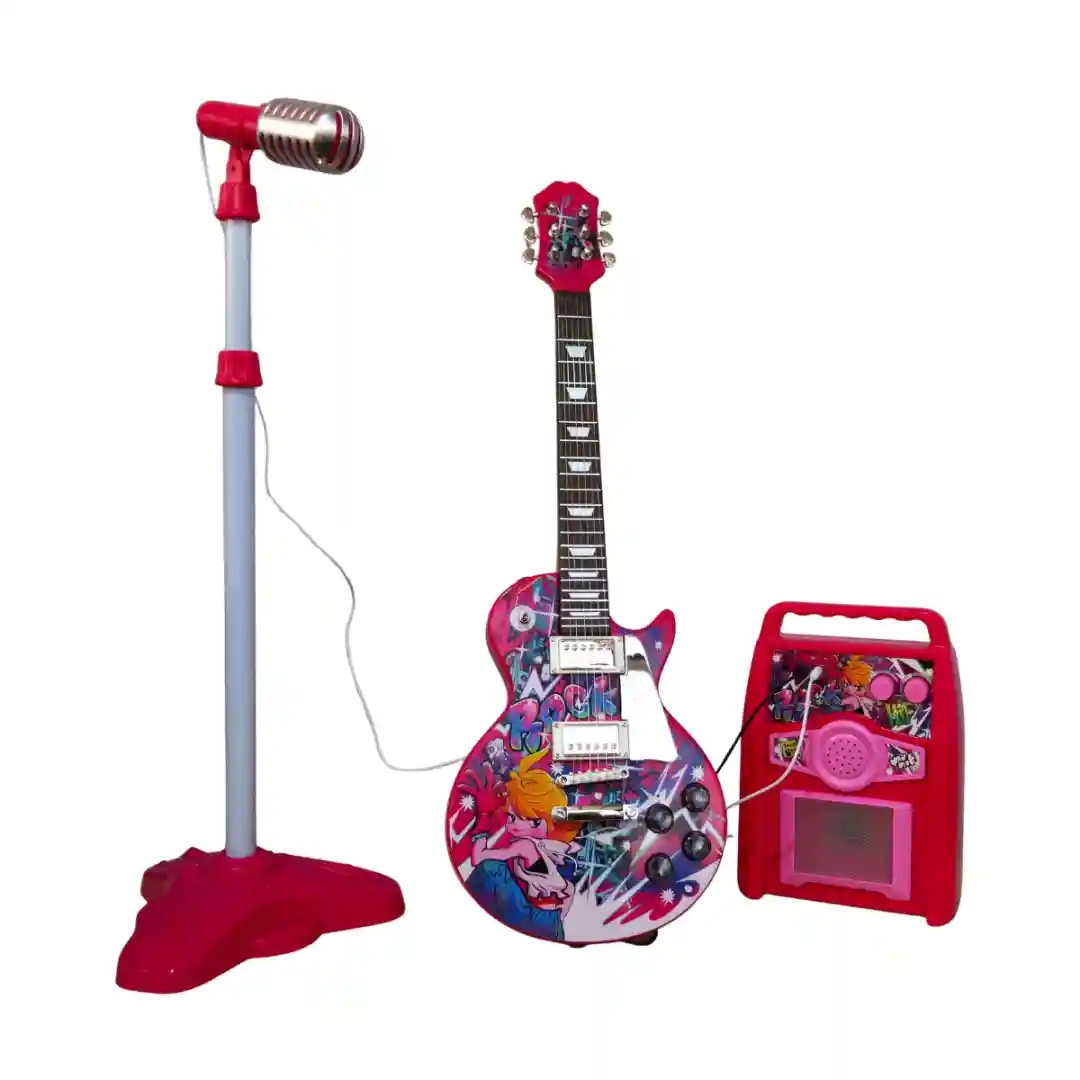 Amplificador Portátil: El set se completa con un pequeño amplificador (altavoz) independiente de color rosa, también decorado con gráficos de rock. La guitarra y el micrófono se conectan al amplificador para que el sonido se escuche fuerte y claro, ¡como en un concierto real!