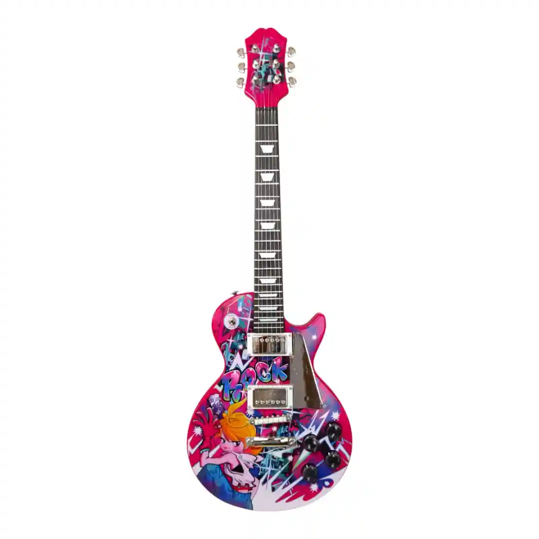 Estampado de Graffiti: La carrocería de la guitarra está cubierta con un llamativo y colorido diseño de graffiti. Los colores principales son el rosa brillante y el azul neón, con ilustraciones que incluyen personajes de estilo cartoon y letras que gritan ROCK.