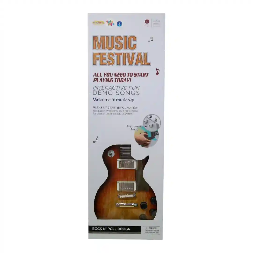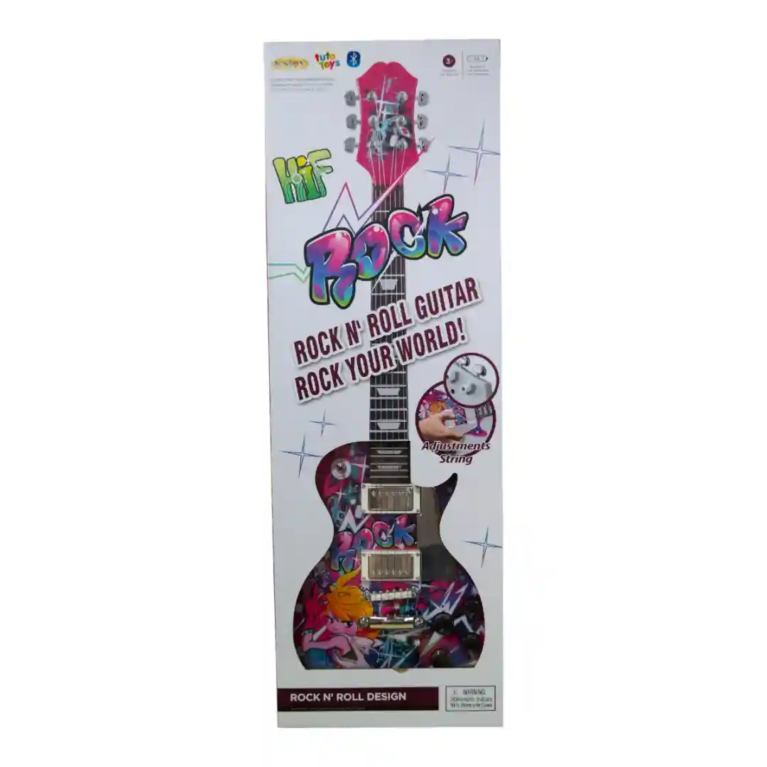 Función Bluetooth: ¡La joya de la corona! La caja sugiere que el set tiene conectividad Bluetooth, lo que permitiría a los niños conectar la guitarra a un dispositivo para tocar junto a sus canciones favoritas o usarla como altavoz.