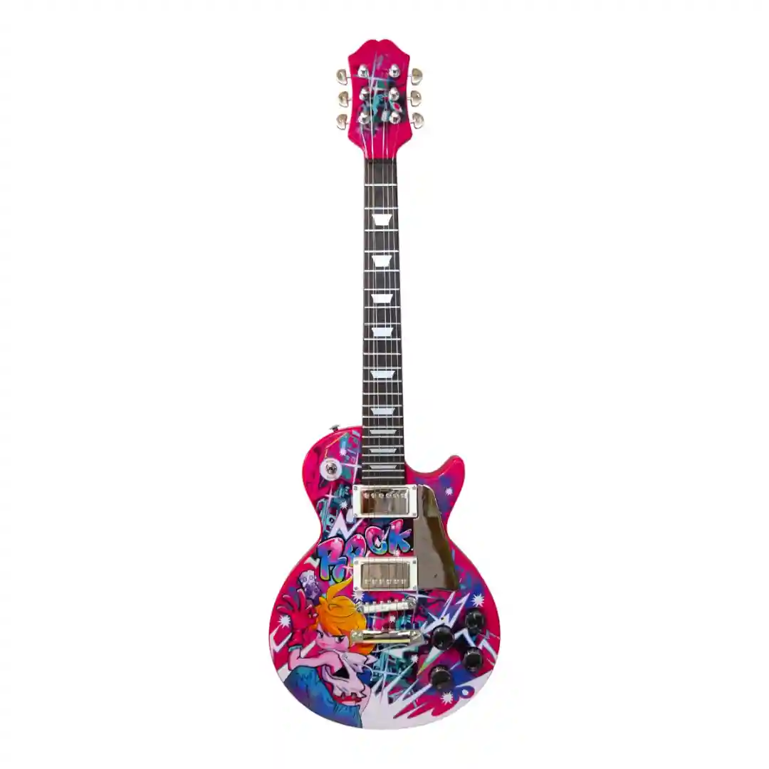 Detalles Realistas: Incluye todos los elementos visuales de una guitarra eléctrica de verdad: seis clavijas en el cabezal, un diapasón con incrustaciones simuladas, pastillas plateadas y botones de control de volumen o tono en la parte inferior del cuerpo.