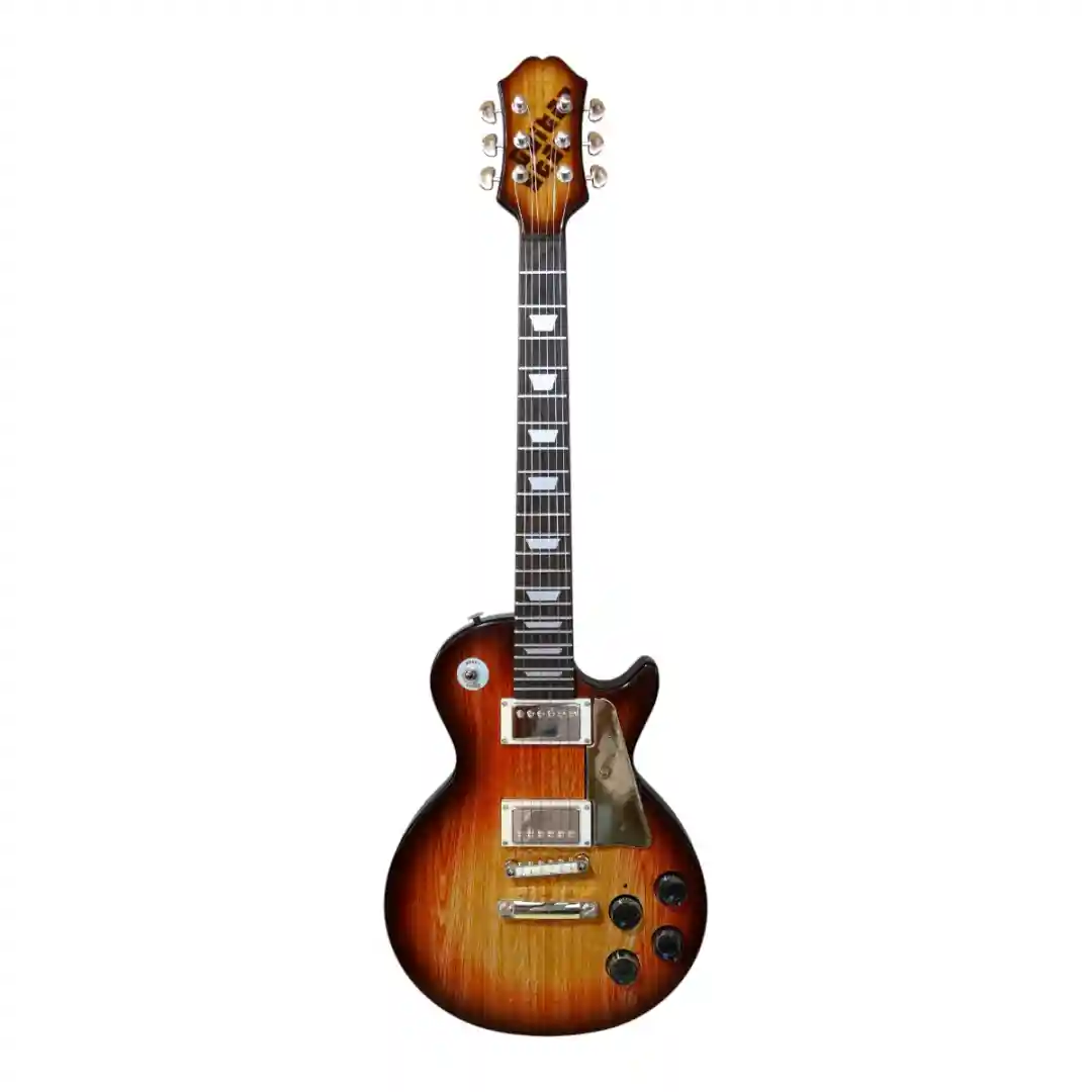 Esta guitarra tiene un diseño clásico y elegante, con un acabado que simula un instrumento profesional: