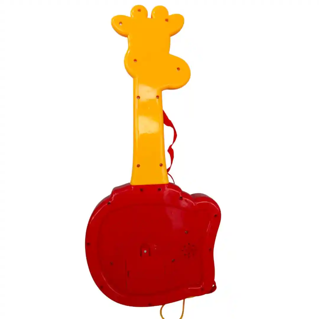 Diseño de Jirafa: La cabeza y el cuello de la jirafa, en color amarillo y naranja, son el marco del juguete. En el cuello, tiene una hilera de botones de colores brillantes (azul, rojo, naranja, verde) que simulan las cuerdas o trastes de una guitarra.
