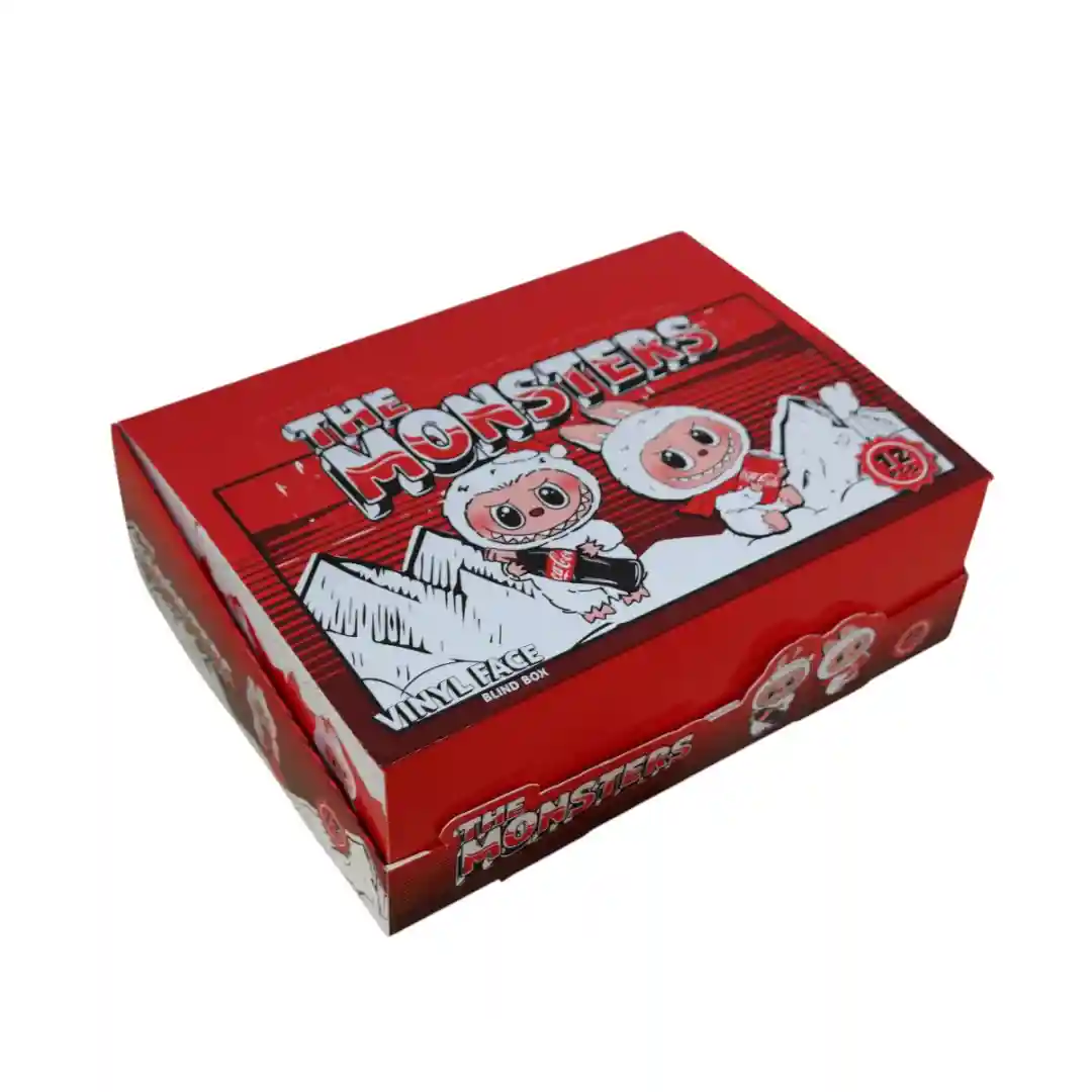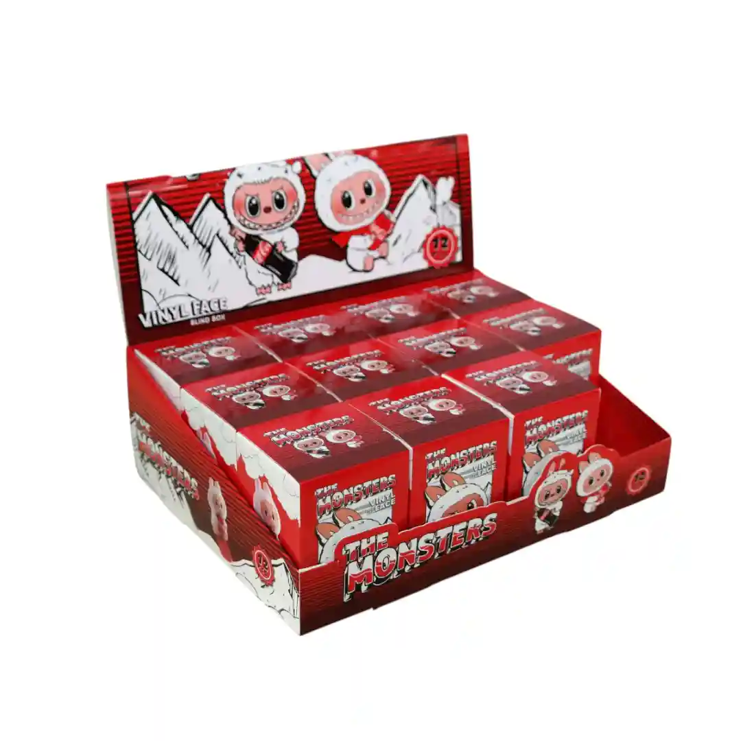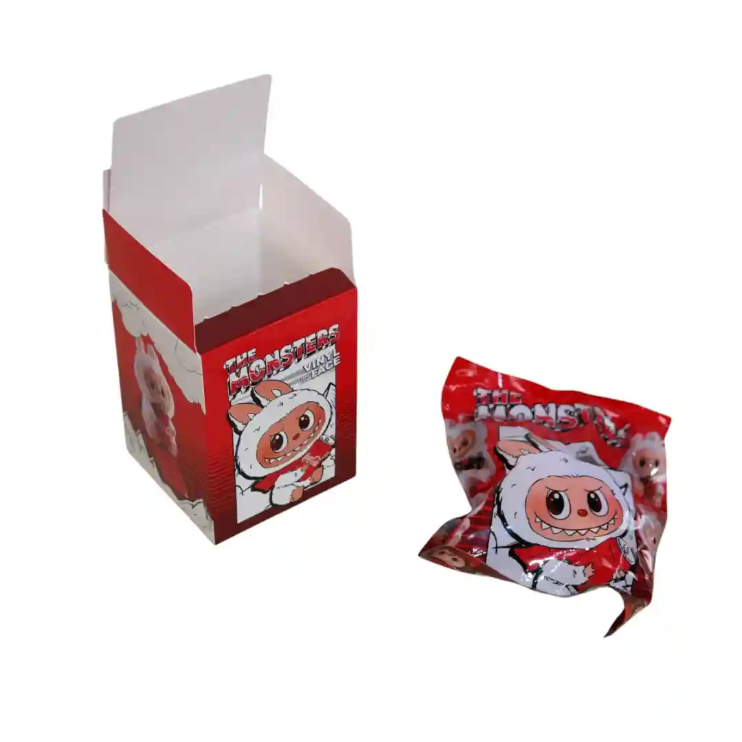 Cada paquete viene con 12 cajas sorpresa, lo que te asegura una experiencia de desempaque llena de emoción. La caja principal tiene un diseño llamativo en rojo y blanco, con ilustraciones de los adorables y un poco traviesos personajes de Labubu en un paisaje nevado, lo que les da un toque único.
