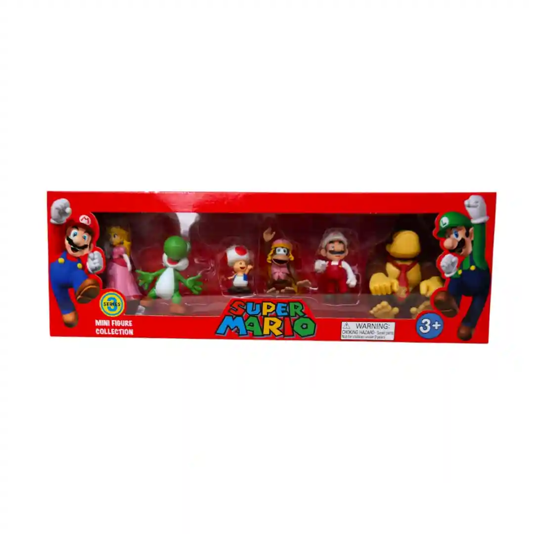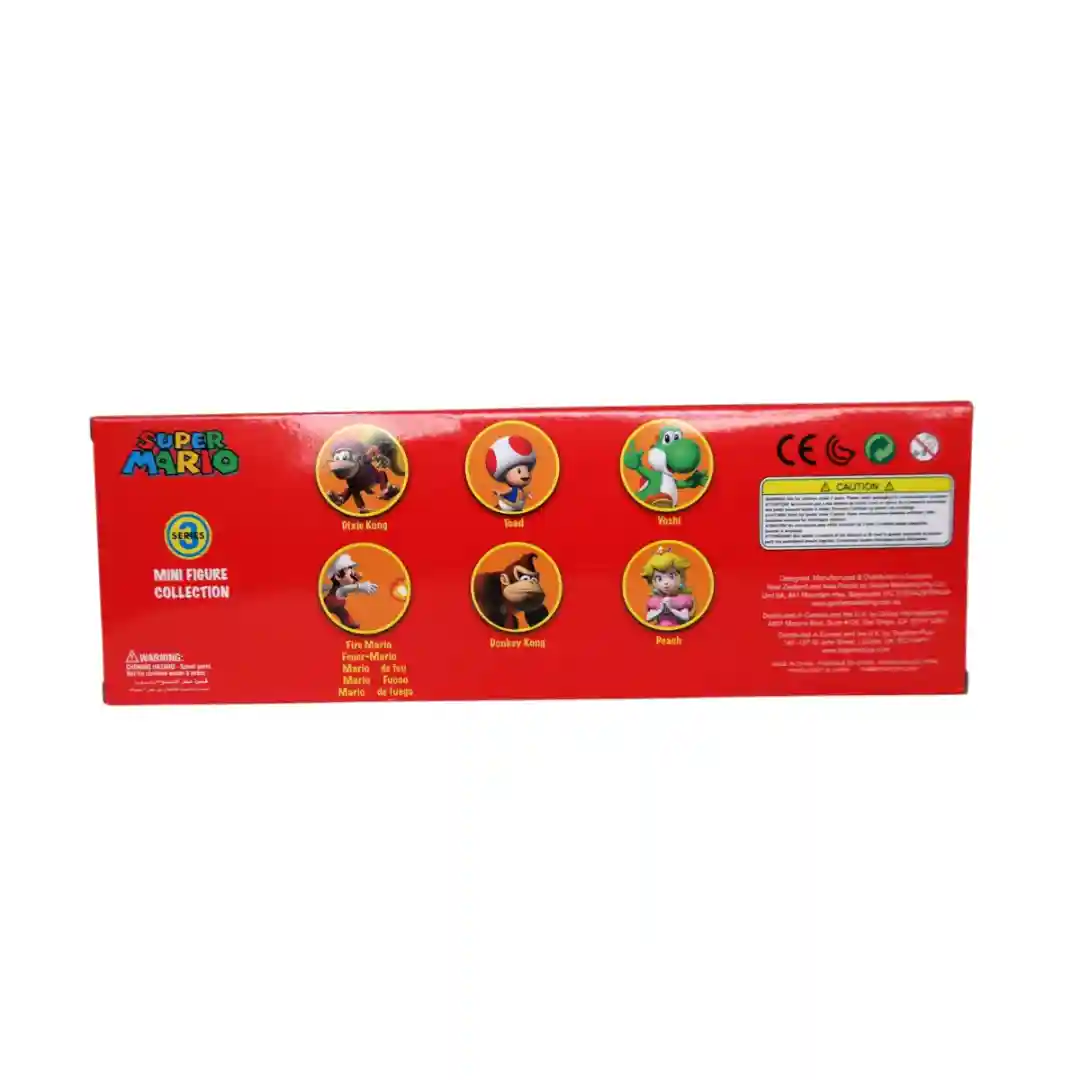Este set de figuras coleccionables es perfecto para jugar, decorar tu habitación o simplemente exhibir tu amor por el universo de Super Mario. La colección está recomendada para mayores de 3 años, y la caja incluye advertencias de seguridad para piezas pequeñas, lo que la hace ideal para los más pequeños.