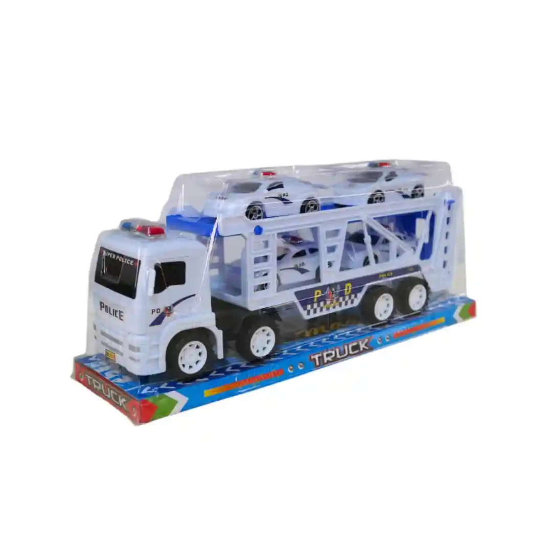 Detalles llamativos: La cabina del camión tiene un diseño moderno, y la plataforma de la mula tiene un patrón de cuadros en los lados que le da un aspecto dinámico. Además, los carros pequeños también tienen impresos el logo de la policía en los costados.