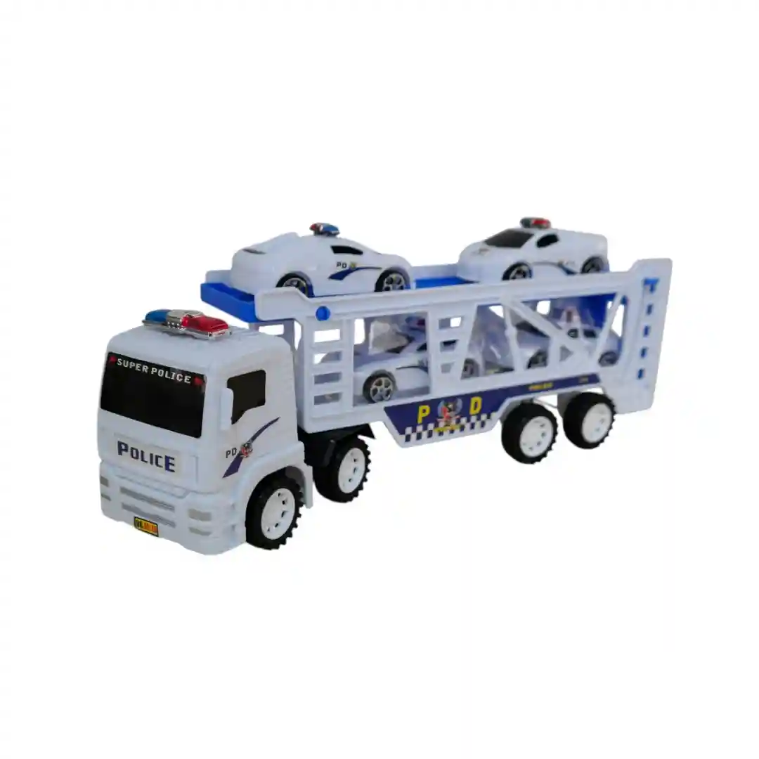 Set de vehículos completo: Este juguete no es solo el camión grande. Viene con cuatro carros de policía más pequeños que se pueden cargar y transportar en la plataforma de la mula. ¡Es como tener un cuartel móvil de la policía! Los carros pequeños también son de color blanco y tienen los mismos diseños que el camión grande.