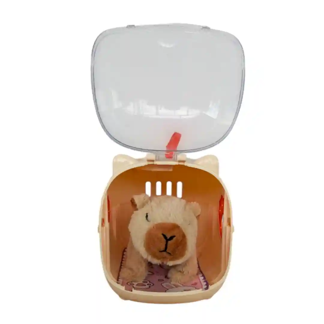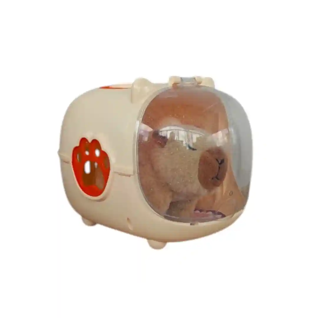 Este set viene en un «guacal» o transportador de mascotas muy realista, con un diseño súper tierno y funcional. Es de un color crema suave, con una puerta transparente que le da un toque moderno y te permite ver a tu mascota en todo momento. La puerta tiene detalles de orejitas de gato en la parte de arriba y se abre hacia arriba para que puedas sacar y meter a tu capibara. Además, ¡tiene un asa anaranjada para que lo puedas llevar a todas partes! Y no te pierdas el detalle de la patita de perro en relieve en uno de los lados, es un toque muy lindo en color anaranjado.