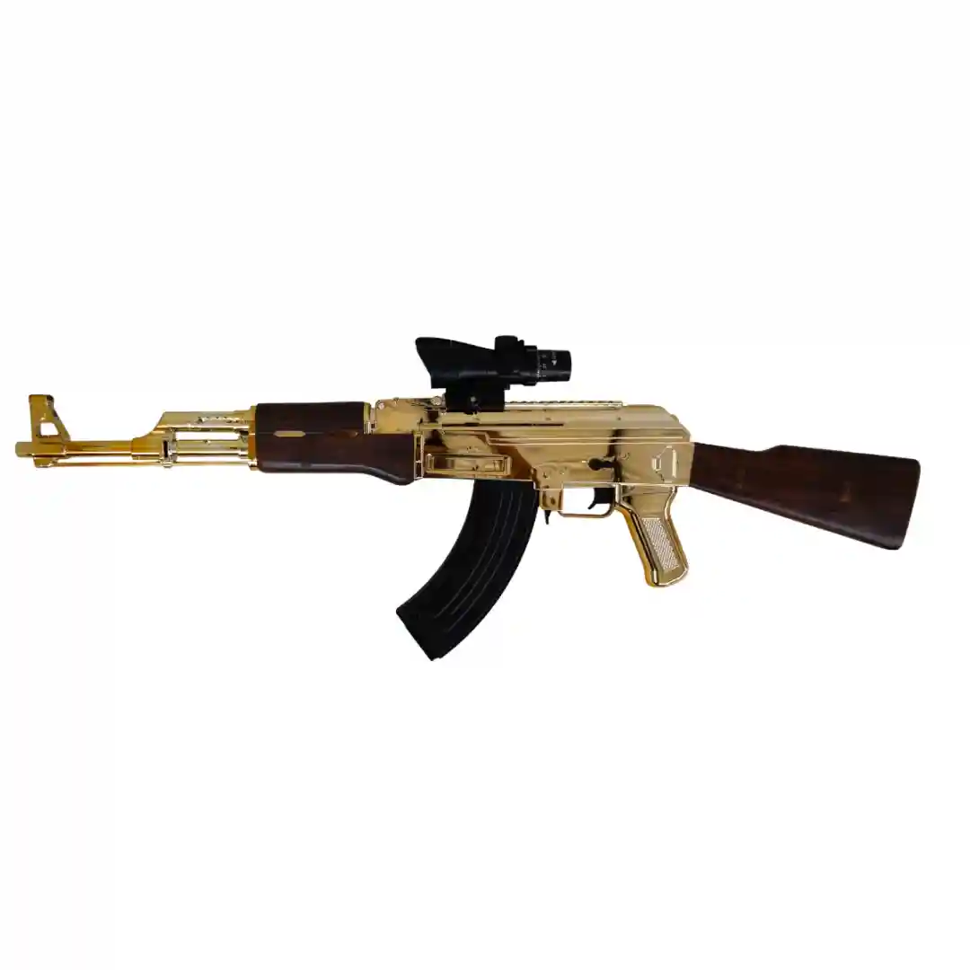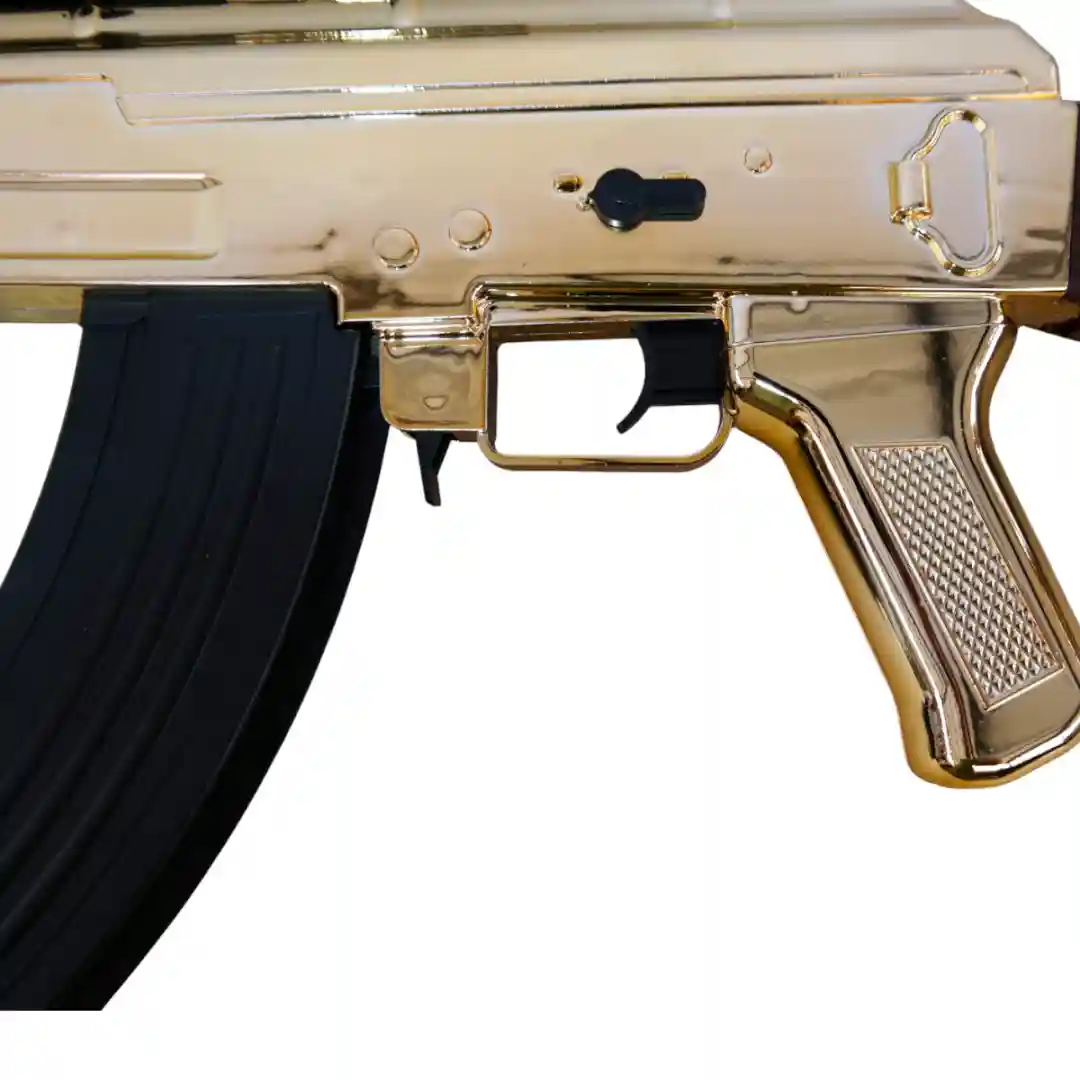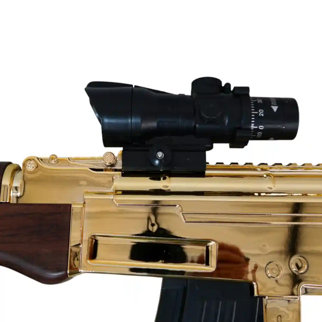 Acabado Dorado Espejo: El cuerpo principal del fusil presume de un deslumbrante acabado dorado brillante, que le da un aspecto de trofeo o de edición especial de lujo. Este no es un juguete común; es una declaración de estilo.
