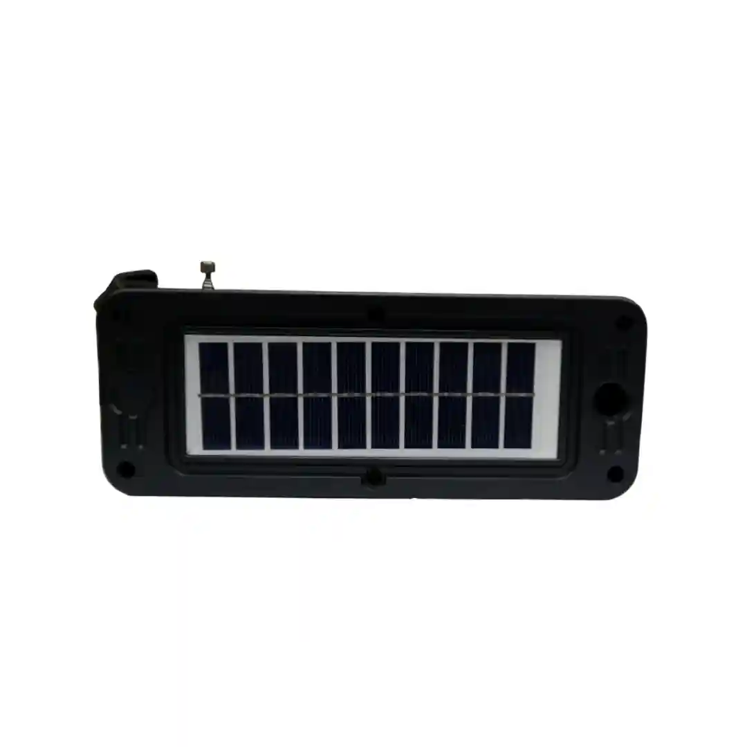 El diseño del radio es moderno y robusto, en un elegante color negro. Tiene un asa que facilita su transporte, lo que lo hace perfecto para llevarlo de viaje, a campamentos, o simplemente para tenerlo en casa. En la parte superior, se encuentra el panel solar para una carga ecológica y eficiente.