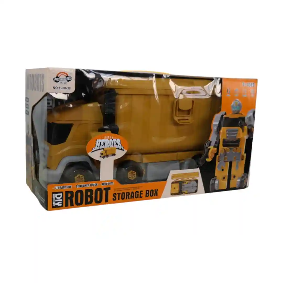 3. Modo Caja de Almacenamiento: La parte trasera del camión, el contenedor, se convierte en una práctica caja de almacenamiento separada. Esta caja es independiente y tiene una tapa con un broche de seguridad robusto, ideal para guardar todos los accesorios del robot o cualquier otro pequeño tesoro.