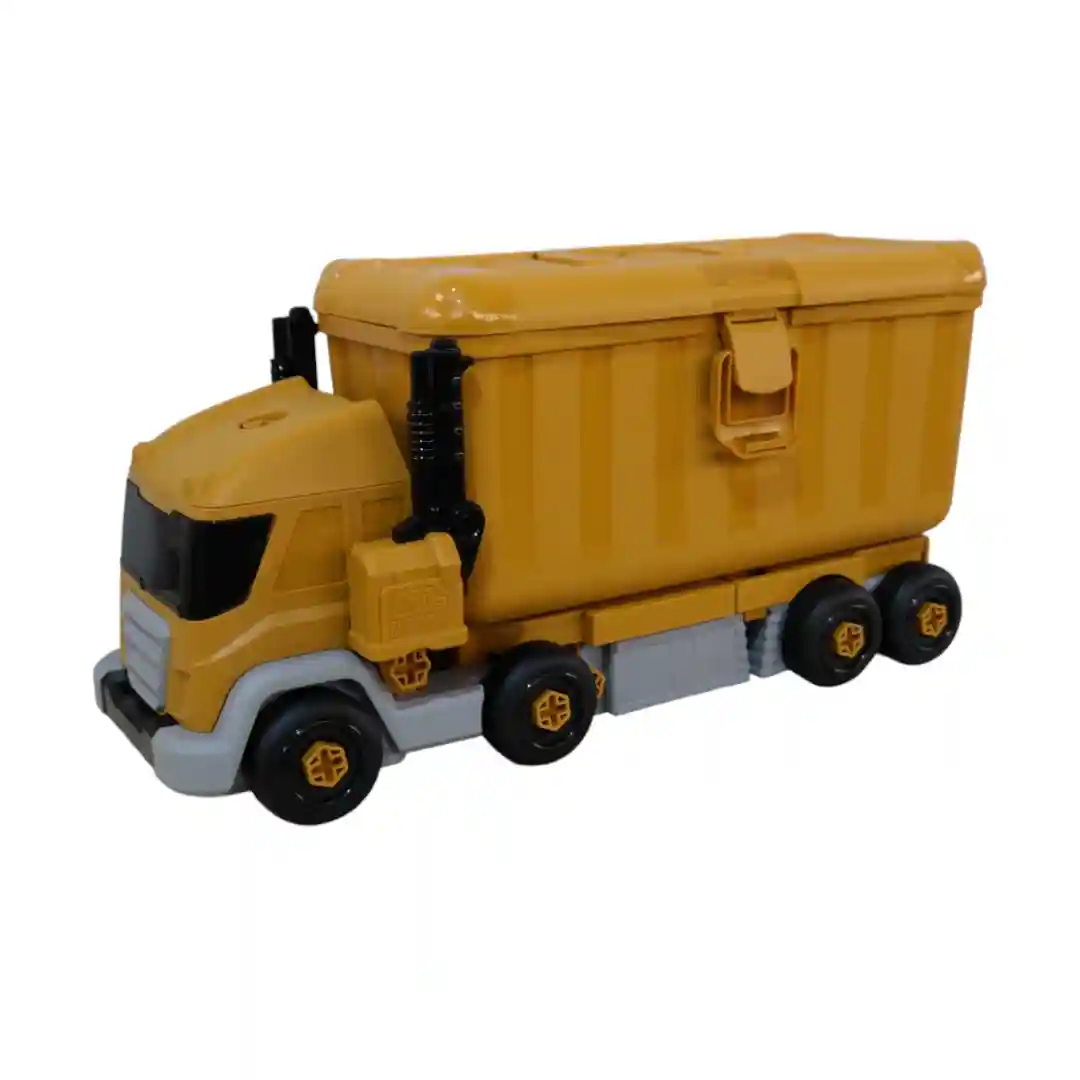 1. Modo Camión Contenedor: El juguete se presenta inicialmente como un camión de estilo contenedor o de construcción en un llamativo color amarillo mostaza y detalles grises/negros. El camión tiene múltiples ruedas y una apariencia robusta, listo para transportar cualquier carga imaginaria.