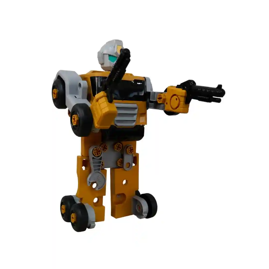 2. Modo Robot Transformable (Autobot): ¡La magia sucede al transformarlo! El camión se desarma y se vuelve a ensamblar para formar un imponente robot al estilo de los «Autobots». El robot resultante tiene un cuerpo articulado, un casco gris y ojos azules/verdes, y un diseño que combina las piezas amarillas, grises y negras. ¡Los tornillos visibles incluso refuerzan la idea de un juguete armable!