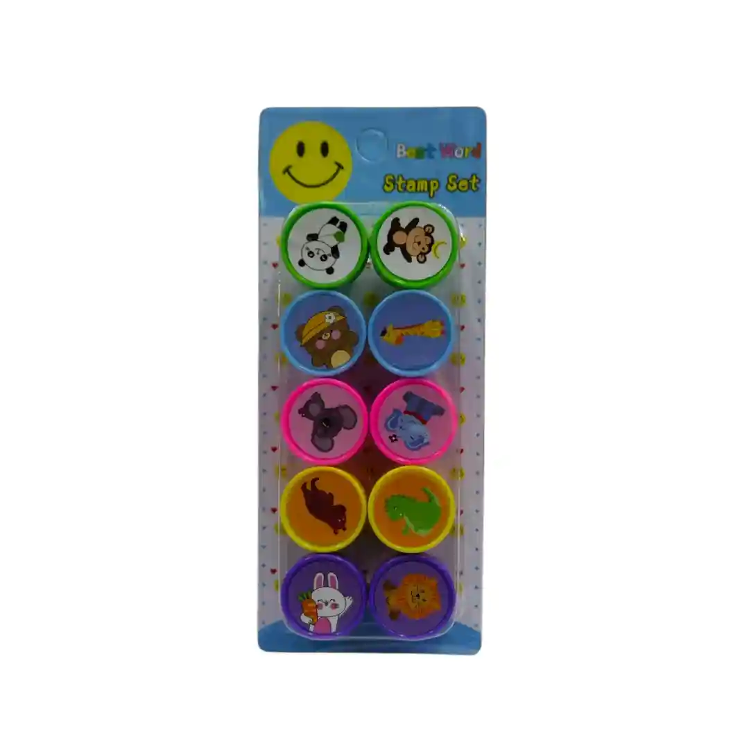 Este paquete viene con 10 sellos redondos, ¡cada uno con un animalito diferente! Vienen en colores vibrantes y alegres, lo que los hace muy atractivos para los niños. En el empaque puedes ver un panda, un mono, un oso, una jirafa, un elefante, un rinoceronte, un perro, un dinosaurio, un conejo y un león. ¡Es una colección de animales súper completa y divertida!