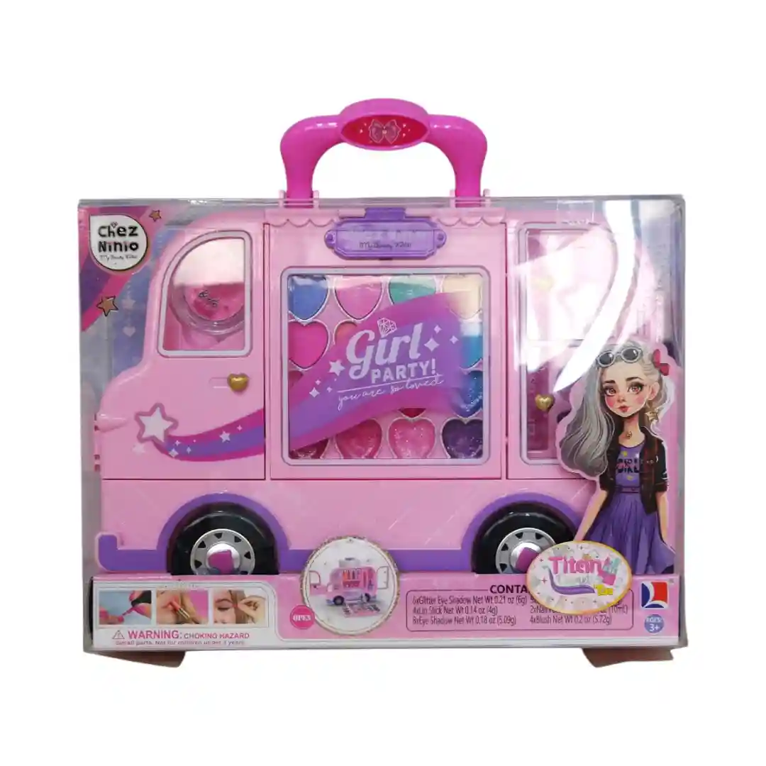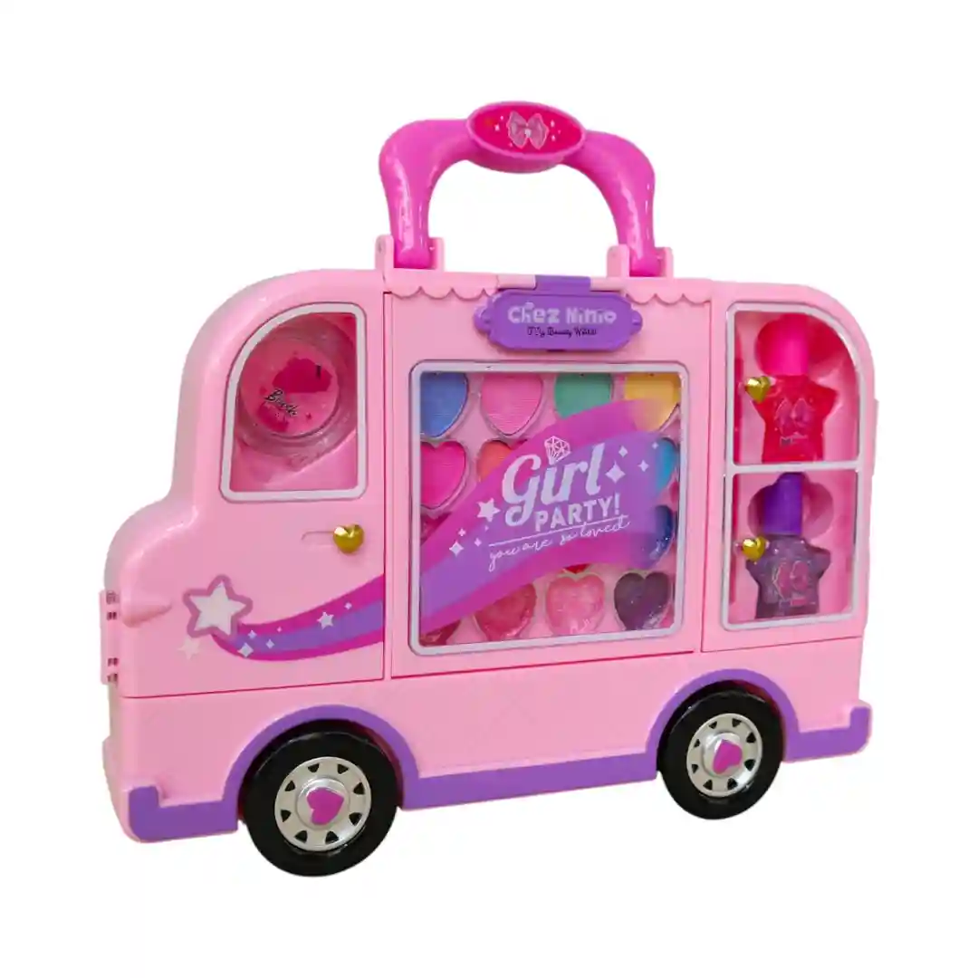 A primera vista, te enamoras del diseño. Este kit viene en una adorable presentación de un camión de belleza de color rosa vibrante y detalles en lila y morado. Es súper práctico, ya que tiene un asa superior también rosa con un moñito, que permite llevarlo como una maleta o un estuche a donde quiera que vaya la diversión. ¡Es como tener una boutique de belleza móvil! El camión está decorado con estrellas y un corazón, con un diseño muy juvenil y moderno, con la frase destacada fiesta de chicas! Eres tan dulce.
